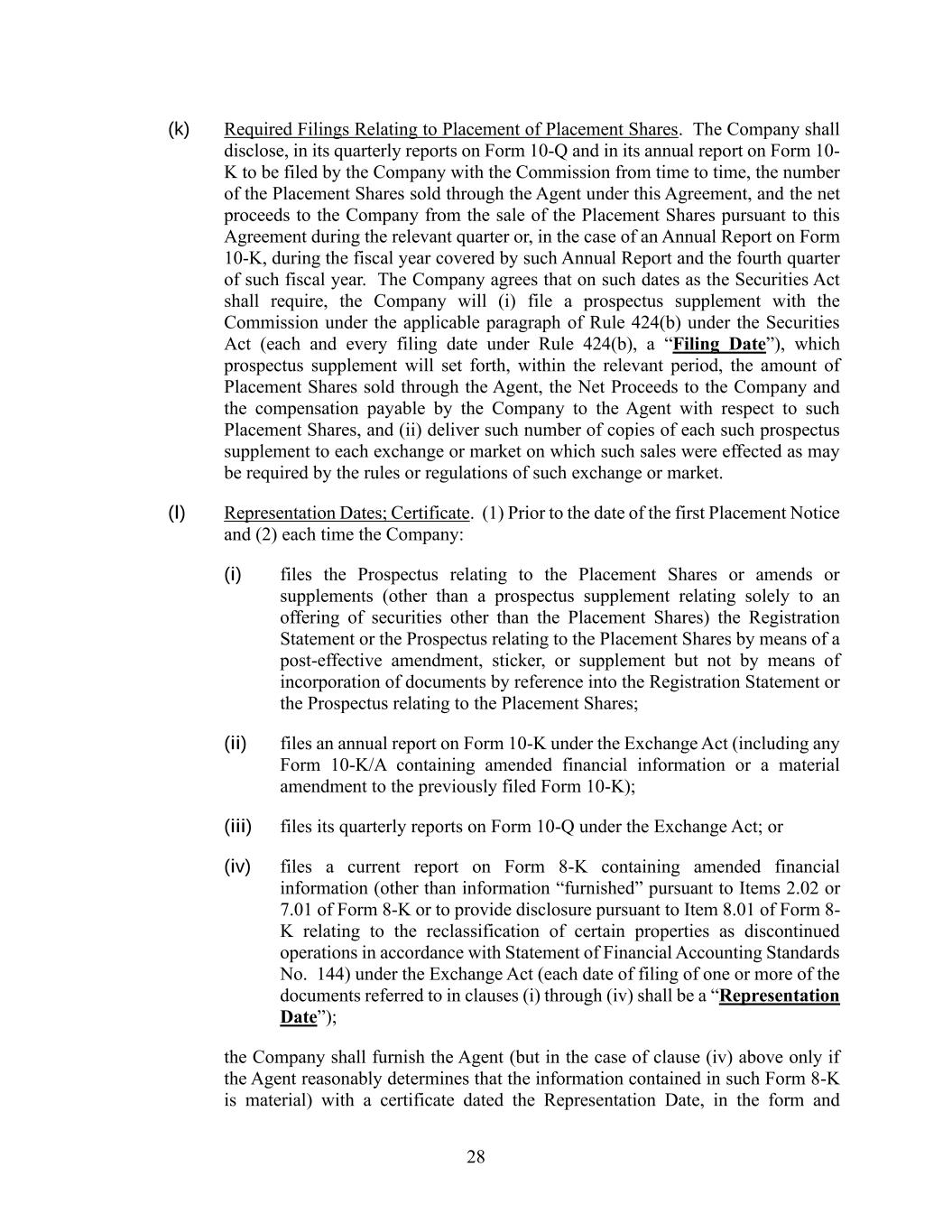 28 (k) Required Filings Relating to Placement of Placement Shares. The Company shall disclose, in its quarterly reports on Form 10-Q and in its annual report on Form 10- K to be filed by the Company with the Commission from time to time, the number of the Placement Shares sold through the Agent under this Agreement, and the net proceeds to the Company from the sale of the Placement Shares pursuant to this Agreement during the relevant quarter or, in the case of an Annual Report on Form 10-K, during the fiscal year covered by such Annual Report and the fourth quarter of such fiscal year. The Company agrees that on such dates as the Securities Act shall require, the Company will (i) file a prospectus supplement with the Commission under the applicable paragraph of Rule 424(b) under the Securities Act (each and every filing date under Rule 424(b), a “Filing Date”), which prospectus supplement will set forth, within the relevant period, the amount of Placement Shares sold through the Agent, the Net Proceeds to the Company and the compensation payable by the Company to the Agent with respect to such Placement Shares, and (ii) deliver such number of copies of each such prospectus supplement to each exchange or market on which such sales were effected as may be required by the rules or regulations of such exchange or market. (l) Representation Dates; Certificate. (1) Prior to the date of the first Placement Notice and (2) each time the Company: (i) files the Prospectus relating to the Placement Shares or amends or supplements (other than a prospectus supplement relating solely to an offering of securities other than the Placement Shares) the Registration Statement or the Prospectus relating to the Placement Shares by means of a post-effective amendment, sticker, or supplement but not by means of incorporation of documents by reference into the Registration Statement or the Prospectus relating to the Placement Shares; (ii) files an annual report on Form 10-K under the Exchange Act (including any Form 10-K/A containing amended financial information or a material amendment to the previously filed Form 10-K); (iii) files its quarterly reports on Form 10-Q under the Exchange Act; or (iv) files a current report on Form 8-K containing amended financial information (other than information “furnished” pursuant to Items 2.02 or 7.01 of Form 8-K or to provide disclosure pursuant to Item 8.01 of Form 8- K relating to the reclassification of certain properties as discontinued operations in accordance with Statement of Financial Accounting Standards No. 144) under the Exchange Act (each date of filing of one or more of the documents referred to in clauses (i) through (iv) shall be a “Representation Date”); the Company shall furnish the Agent (but in the case of clause (iv) above only if the Agent reasonably determines that the information contained in such Form 8-K is material) with a certificate dated the Representation Date, in the form and