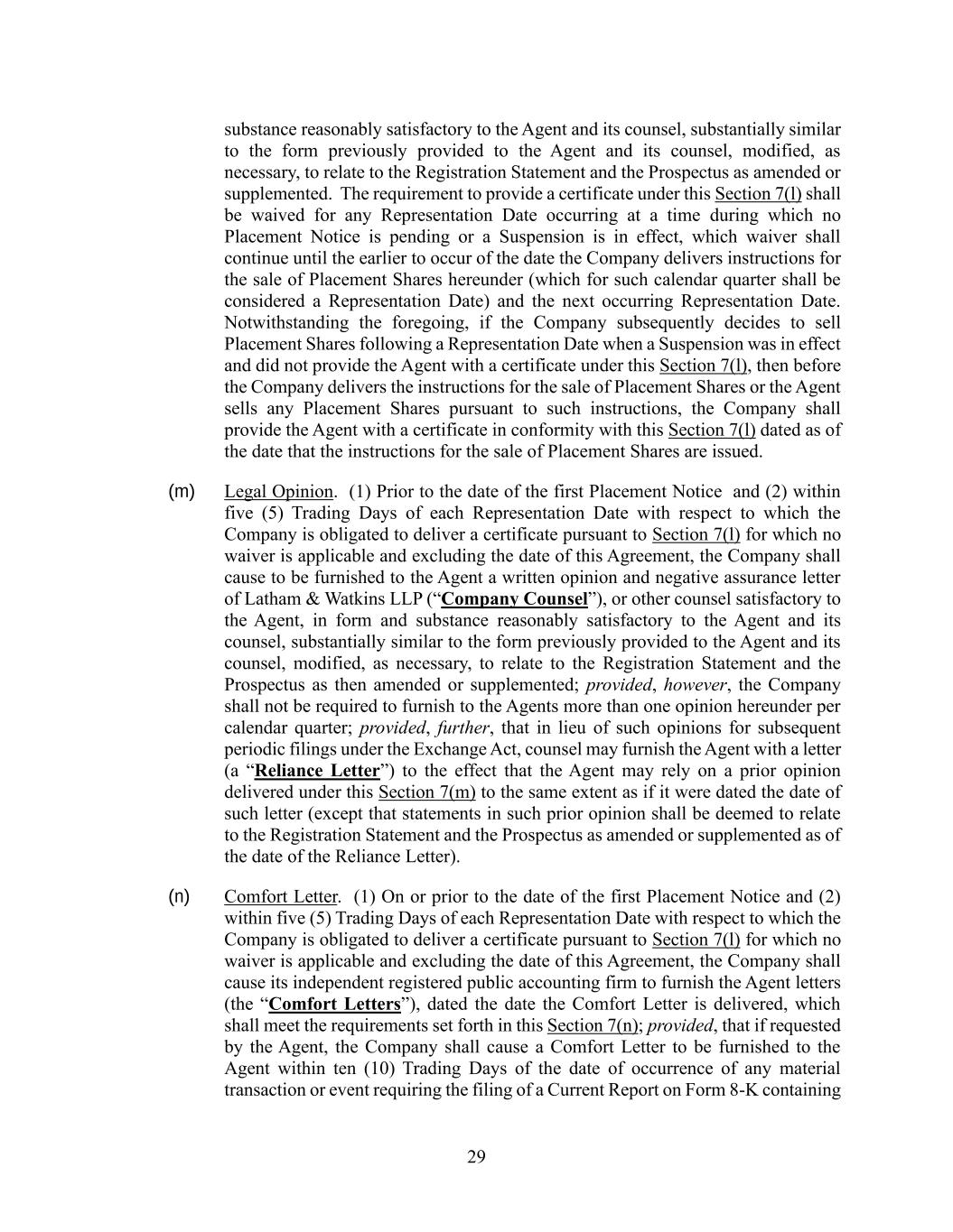 29 substance reasonably satisfactory to the Agent and its counsel, substantially similar to the form previously provided to the Agent and its counsel, modified, as necessary, to relate to the Registration Statement and the Prospectus as amended or supplemented. The requirement to provide a certificate under this Section 7(l) shall be waived for any Representation Date occurring at a time during which no Placement Notice is pending or a Suspension is in effect, which waiver shall continue until the earlier to occur of the date the Company delivers instructions for the sale of Placement Shares hereunder (which for such calendar quarter shall be considered a Representation Date) and the next occurring Representation Date. Notwithstanding the foregoing, if the Company subsequently decides to sell Placement Shares following a Representation Date when a Suspension was in effect and did not provide the Agent with a certificate under this Section 7(l), then before the Company delivers the instructions for the sale of Placement Shares or the Agent sells any Placement Shares pursuant to such instructions, the Company shall provide the Agent with a certificate in conformity with this Section 7(l) dated as of the date that the instructions for the sale of Placement Shares are issued. (m) Legal Opinion. (1) Prior to the date of the first Placement Notice and (2) within five (5) Trading Days of each Representation Date with respect to which the Company is obligated to deliver a certificate pursuant to Section 7(l) for which no waiver is applicable and excluding the date of this Agreement, the Company shall cause to be furnished to the Agent a written opinion and negative assurance letter of Latham & Watkins LLP (“Company Counsel”), or other counsel satisfactory to the Agent, in form and substance reasonably satisfactory to the Agent and its counsel, substantially similar to the form previously provided to the Agent and its counsel, modified, as necessary, to relate to the Registration Statement and the Prospectus as then amended or supplemented; provided, however, the Company shall not be required to furnish to the Agents more than one opinion hereunder per calendar quarter; provided, further, that in lieu of such opinions for subsequent periodic filings under the Exchange Act, counsel may furnish the Agent with a letter (a “Reliance Letter”) to the effect that the Agent may rely on a prior opinion delivered under this Section 7(m) to the same extent as if it were dated the date of such letter (except that statements in such prior opinion shall be deemed to relate to the Registration Statement and the Prospectus as amended or supplemented as of the date of the Reliance Letter). (n) Comfort Letter. (1) On or prior to the date of the first Placement Notice and (2) within five (5) Trading Days of each Representation Date with respect to which the Company is obligated to deliver a certificate pursuant to Section 7(l) for which no waiver is applicable and excluding the date of this Agreement, the Company shall cause its independent registered public accounting firm to furnish the Agent letters (the “Comfort Letters”), dated the date the Comfort Letter is delivered, which shall meet the requirements set forth in this Section 7(n); provided, that if requested by the Agent, the Company shall cause a Comfort Letter to be furnished to the Agent within ten (10) Trading Days of the date of occurrence of any material transaction or event requiring the filing of a Current Report on Form 8-K containing