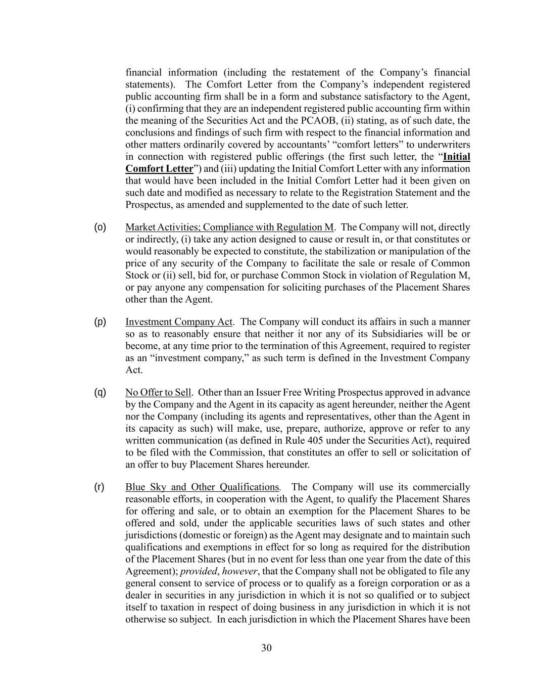 30 financial information (including the restatement of the Company’s financial statements). The Comfort Letter from the Company’s independent registered public accounting firm shall be in a form and substance satisfactory to the Agent, (i) confirming that they are an independent registered public accounting firm within the meaning of the Securities Act and the PCAOB, (ii) stating, as of such date, the conclusions and findings of such firm with respect to the financial information and other matters ordinarily covered by accountants’ “comfort letters” to underwriters in connection with registered public offerings (the first such letter, the “Initial Comfort Letter”) and (iii) updating the Initial Comfort Letter with any information that would have been included in the Initial Comfort Letter had it been given on such date and modified as necessary to relate to the Registration Statement and the Prospectus, as amended and supplemented to the date of such letter. (o) Market Activities; Compliance with Regulation M. The Company will not, directly or indirectly, (i) take any action designed to cause or result in, or that constitutes or would reasonably be expected to constitute, the stabilization or manipulation of the price of any security of the Company to facilitate the sale or resale of Common Stock or (ii) sell, bid for, or purchase Common Stock in violation of Regulation M, or pay anyone any compensation for soliciting purchases of the Placement Shares other than the Agent. (p) Investment Company Act. The Company will conduct its affairs in such a manner so as to reasonably ensure that neither it nor any of its Subsidiaries will be or become, at any time prior to the termination of this Agreement, required to register as an “investment company,” as such term is defined in the Investment Company Act. (q) No Offer to Sell. Other than an Issuer Free Writing Prospectus approved in advance by the Company and the Agent in its capacity as agent hereunder, neither the Agent nor the Company (including its agents and representatives, other than the Agent in its capacity as such) will make, use, prepare, authorize, approve or refer to any written communication (as defined in Rule 405 under the Securities Act), required to be filed with the Commission, that constitutes an offer to sell or solicitation of an offer to buy Placement Shares hereunder. (r) Blue Sky and Other Qualifications. The Company will use its commercially reasonable efforts, in cooperation with the Agent, to qualify the Placement Shares for offering and sale, or to obtain an exemption for the Placement Shares to be offered and sold, under the applicable securities laws of such states and other jurisdictions (domestic or foreign) as the Agent may designate and to maintain such qualifications and exemptions in effect for so long as required for the distribution of the Placement Shares (but in no event for less than one year from the date of this Agreement); provided, however, that the Company shall not be obligated to file any general consent to service of process or to qualify as a foreign corporation or as a dealer in securities in any jurisdiction in which it is not so qualified or to subject itself to taxation in respect of doing business in any jurisdiction in which it is not otherwise so subject. In each jurisdiction in which the Placement Shares have been