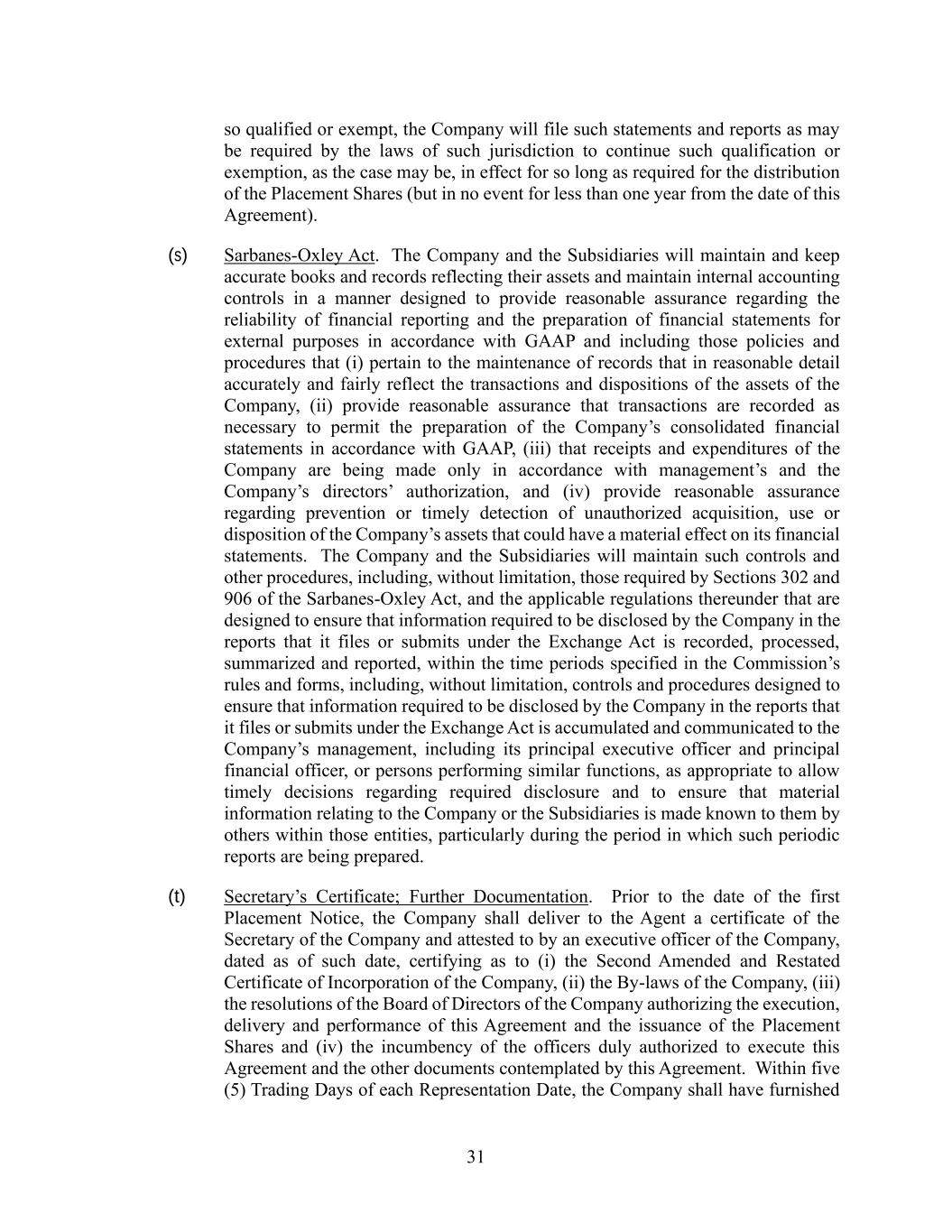 31 so qualified or exempt, the Company will file such statements and reports as may be required by the laws of such jurisdiction to continue such qualification or exemption, as the case may be, in effect for so long as required for the distribution of the Placement Shares (but in no event for less than one year from the date of this Agreement). (s) Sarbanes-Oxley Act. The Company and the Subsidiaries will maintain and keep accurate books and records reflecting their assets and maintain internal accounting controls in a manner designed to provide reasonable assurance regarding the reliability of financial reporting and the preparation of financial statements for external purposes in accordance with GAAP and including those policies and procedures that (i) pertain to the maintenance of records that in reasonable detail accurately and fairly reflect the transactions and dispositions of the assets of the Company, (ii) provide reasonable assurance that transactions are recorded as necessary to permit the preparation of the Company’s consolidated financial statements in accordance with GAAP, (iii) that receipts and expenditures of the Company are being made only in accordance with management’s and the Company’s directors’ authorization, and (iv) provide reasonable assurance regarding prevention or timely detection of unauthorized acquisition, use or disposition of the Company’s assets that could have a material effect on its financial statements. The Company and the Subsidiaries will maintain such controls and other procedures, including, without limitation, those required by Sections 302 and 906 of the Sarbanes-Oxley Act, and the applicable regulations thereunder that are designed to ensure that information required to be disclosed by the Company in the reports that it files or submits under the Exchange Act is recorded, processed, summarized and reported, within the time periods specified in the Commission’s rules and forms, including, without limitation, controls and procedures designed to ensure that information required to be disclosed by the Company in the reports that it files or submits under the Exchange Act is accumulated and communicated to the Company’s management, including its principal executive officer and principal financial officer, or persons performing similar functions, as appropriate to allow timely decisions regarding required disclosure and to ensure that material information relating to the Company or the Subsidiaries is made known to them by others within those entities, particularly during the period in which such periodic reports are being prepared. (t) Secretary’s Certificate; Further Documentation. Prior to the date of the first Placement Notice, the Company shall deliver to the Agent a certificate of the Secretary of the Company and attested to by an executive officer of the Company, dated as of such date, certifying as to (i) the Second Amended and Restated Certificate of Incorporation of the Company, (ii) the By-laws of the Company, (iii) the resolutions of the Board of Directors of the Company authorizing the execution, delivery and performance of this Agreement and the issuance of the Placement Shares and (iv) the incumbency of the officers duly authorized to execute this Agreement and the other documents contemplated by this Agreement. Within five (5) Trading Days of each Representation Date, the Company shall have furnished