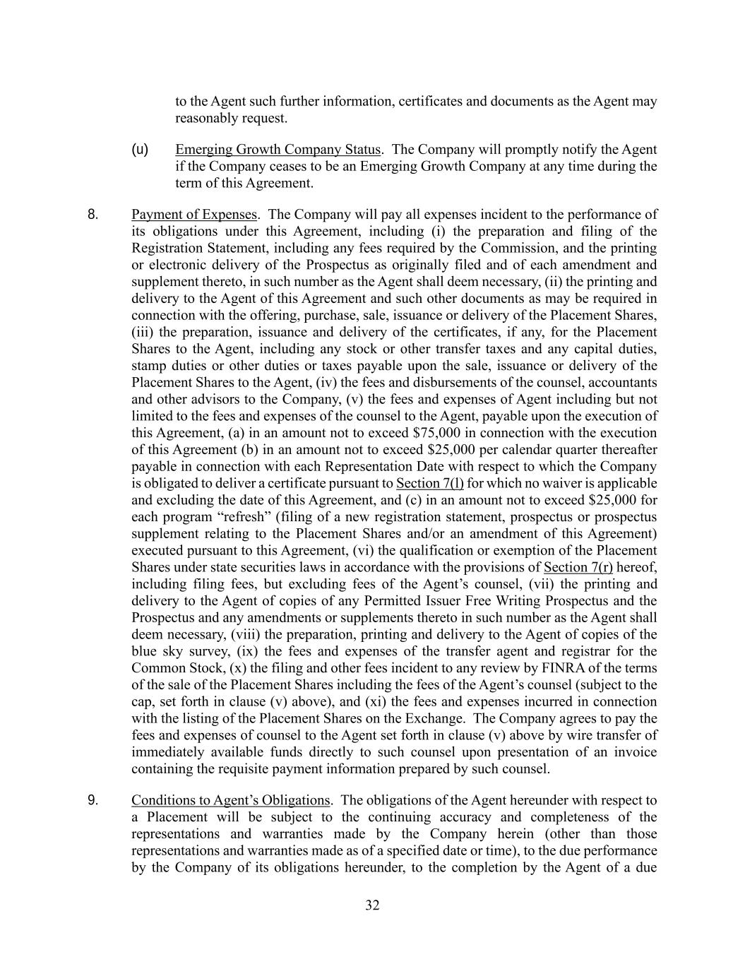 32 to the Agent such further information, certificates and documents as the Agent may reasonably request. (u) Emerging Growth Company Status. The Company will promptly notify the Agent if the Company ceases to be an Emerging Growth Company at any time during the term of this Agreement. 8. Payment of Expenses. The Company will pay all expenses incident to the performance of its obligations under this Agreement, including (i) the preparation and filing of the Registration Statement, including any fees required by the Commission, and the printing or electronic delivery of the Prospectus as originally filed and of each amendment and supplement thereto, in such number as the Agent shall deem necessary, (ii) the printing and delivery to the Agent of this Agreement and such other documents as may be required in connection with the offering, purchase, sale, issuance or delivery of the Placement Shares, (iii) the preparation, issuance and delivery of the certificates, if any, for the Placement Shares to the Agent, including any stock or other transfer taxes and any capital duties, stamp duties or other duties or taxes payable upon the sale, issuance or delivery of the Placement Shares to the Agent, (iv) the fees and disbursements of the counsel, accountants and other advisors to the Company, (v) the fees and expenses of Agent including but not limited to the fees and expenses of the counsel to the Agent, payable upon the execution of this Agreement, (a) in an amount not to exceed $75,000 in connection with the execution of this Agreement (b) in an amount not to exceed $25,000 per calendar quarter thereafter payable in connection with each Representation Date with respect to which the Company is obligated to deliver a certificate pursuant to Section 7(l) for which no waiver is applicable and excluding the date of this Agreement, and (c) in an amount not to exceed $25,000 for each program “refresh” (filing of a new registration statement, prospectus or prospectus supplement relating to the Placement Shares and/or an amendment of this Agreement) executed pursuant to this Agreement, (vi) the qualification or exemption of the Placement Shares under state securities laws in accordance with the provisions of Section 7(r) hereof, including filing fees, but excluding fees of the Agent’s counsel, (vii) the printing and delivery to the Agent of copies of any Permitted Issuer Free Writing Prospectus and the Prospectus and any amendments or supplements thereto in such number as the Agent shall deem necessary, (viii) the preparation, printing and delivery to the Agent of copies of the blue sky survey, (ix) the fees and expenses of the transfer agent and registrar for the Common Stock, (x) the filing and other fees incident to any review by FINRA of the terms of the sale of the Placement Shares including the fees of the Agent’s counsel (subject to the cap, set forth in clause (v) above), and (xi) the fees and expenses incurred in connection with the listing of the Placement Shares on the Exchange. The Company agrees to pay the fees and expenses of counsel to the Agent set forth in clause (v) above by wire transfer of immediately available funds directly to such counsel upon presentation of an invoice containing the requisite payment information prepared by such counsel. 9. Conditions to Agent’s Obligations. The obligations of the Agent hereunder with respect to a Placement will be subject to the continuing accuracy and completeness of the representations and warranties made by the Company herein (other than those representations and warranties made as of a specified date or time), to the due performance by the Company of its obligations hereunder, to the completion by the Agent of a due
