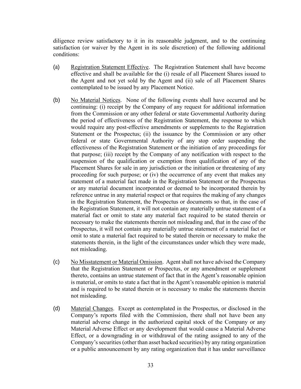 33 diligence review satisfactory to it in its reasonable judgment, and to the continuing satisfaction (or waiver by the Agent in its sole discretion) of the following additional conditions: (a) Registration Statement Effective. The Registration Statement shall have become effective and shall be available for the (i) resale of all Placement Shares issued to the Agent and not yet sold by the Agent and (ii) sale of all Placement Shares contemplated to be issued by any Placement Notice. (b) No Material Notices. None of the following events shall have occurred and be continuing: (i) receipt by the Company of any request for additional information from the Commission or any other federal or state Governmental Authority during the period of effectiveness of the Registration Statement, the response to which would require any post-effective amendments or supplements to the Registration Statement or the Prospectus; (ii) the issuance by the Commission or any other federal or state Governmental Authority of any stop order suspending the effectiveness of the Registration Statement or the initiation of any proceedings for that purpose; (iii) receipt by the Company of any notification with respect to the suspension of the qualification or exemption from qualification of any of the Placement Shares for sale in any jurisdiction or the initiation or threatening of any proceeding for such purpose; or (iv) the occurrence of any event that makes any statement of a material fact made in the Registration Statement or the Prospectus or any material document incorporated or deemed to be incorporated therein by reference untrue in any material respect or that requires the making of any changes in the Registration Statement, the Prospectus or documents so that, in the case of the Registration Statement, it will not contain any materially untrue statement of a material fact or omit to state any material fact required to be stated therein or necessary to make the statements therein not misleading and, that in the case of the Prospectus, it will not contain any materially untrue statement of a material fact or omit to state a material fact required to be stated therein or necessary to make the statements therein, in the light of the circumstances under which they were made, not misleading. (c) No Misstatement or Material Omission. Agent shall not have advised the Company that the Registration Statement or Prospectus, or any amendment or supplement thereto, contains an untrue statement of fact that in the Agent’s reasonable opinion is material, or omits to state a fact that in the Agent’s reasonable opinion is material and is required to be stated therein or is necessary to make the statements therein not misleading. (d) Material Changes. Except as contemplated in the Prospectus, or disclosed in the Company’s reports filed with the Commission, there shall not have been any material adverse change in the authorized capital stock of the Company or any Material Adverse Effect or any development that would cause a Material Adverse Effect, or a downgrading in or withdrawal of the rating assigned to any of the Company’s securities (other than asset backed securities) by any rating organization or a public announcement by any rating organization that it has under surveillance