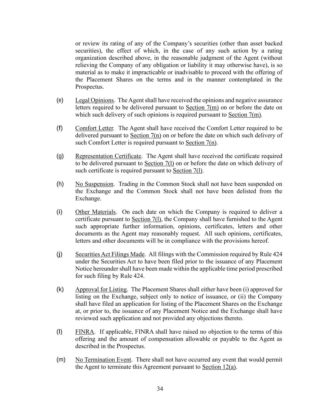 34 or review its rating of any of the Company’s securities (other than asset backed securities), the effect of which, in the case of any such action by a rating organization described above, in the reasonable judgment of the Agent (without relieving the Company of any obligation or liability it may otherwise have), is so material as to make it impracticable or inadvisable to proceed with the offering of the Placement Shares on the terms and in the manner contemplated in the Prospectus. (e) Legal Opinions. The Agent shall have received the opinions and negative assurance letters required to be delivered pursuant to Section 7(m) on or before the date on which such delivery of such opinions is required pursuant to Section 7(m). (f) Comfort Letter. The Agent shall have received the Comfort Letter required to be delivered pursuant to Section 7(n) on or before the date on which such delivery of such Comfort Letter is required pursuant to Section 7(n). (g) Representation Certificate. The Agent shall have received the certificate required to be delivered pursuant to Section 7(l) on or before the date on which delivery of such certificate is required pursuant to Section 7(l). (h) No Suspension. Trading in the Common Stock shall not have been suspended on the Exchange and the Common Stock shall not have been delisted from the Exchange. (i) Other Materials. On each date on which the Company is required to deliver a certificate pursuant to Section 7(l), the Company shall have furnished to the Agent such appropriate further information, opinions, certificates, letters and other documents as the Agent may reasonably request. All such opinions, certificates, letters and other documents will be in compliance with the provisions hereof. (j) Securities Act Filings Made. All filings with the Commission required by Rule 424 under the Securities Act to have been filed prior to the issuance of any Placement Notice hereunder shall have been made within the applicable time period prescribed for such filing by Rule 424. (k) Approval for Listing. The Placement Shares shall either have been (i) approved for listing on the Exchange, subject only to notice of issuance, or (ii) the Company shall have filed an application for listing of the Placement Shares on the Exchange at, or prior to, the issuance of any Placement Notice and the Exchange shall have reviewed such application and not provided any objections thereto. (l) FINRA. If applicable, FINRA shall have raised no objection to the terms of this offering and the amount of compensation allowable or payable to the Agent as described in the Prospectus. (m) No Termination Event. There shall not have occurred any event that would permit the Agent to terminate this Agreement pursuant to Section 12(a).