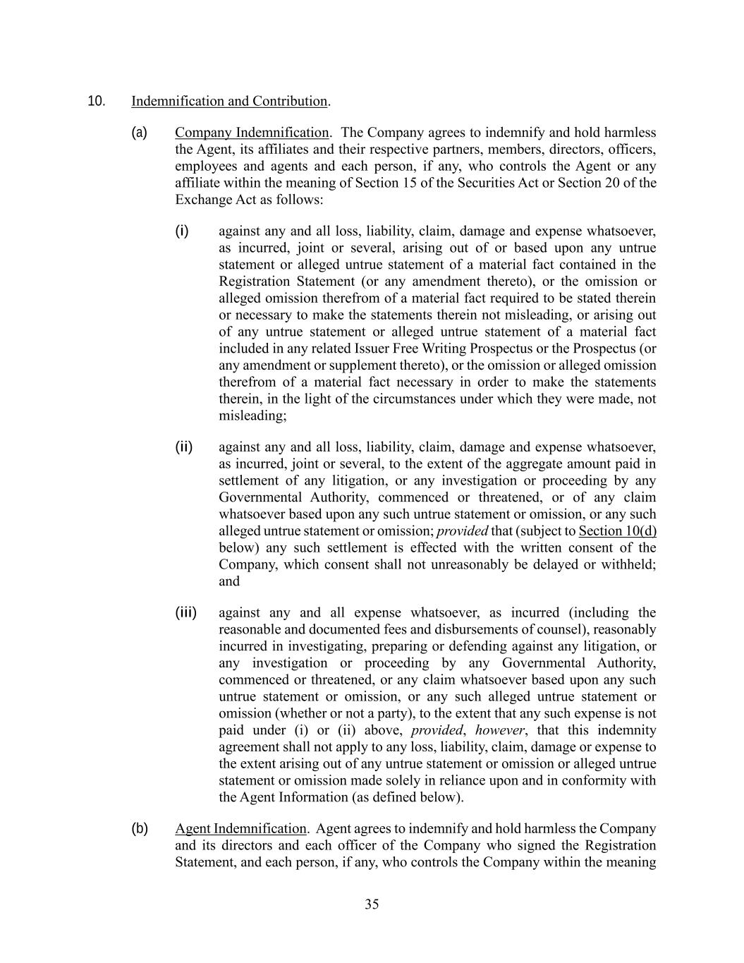 35 10. Indemnification and Contribution. (a) Company Indemnification. The Company agrees to indemnify and hold harmless the Agent, its affiliates and their respective partners, members, directors, officers, employees and agents and each person, if any, who controls the Agent or any affiliate within the meaning of Section 15 of the Securities Act or Section 20 of the Exchange Act as follows: (i) against any and all loss, liability, claim, damage and expense whatsoever, as incurred, joint or several, arising out of or based upon any untrue statement or alleged untrue statement of a material fact contained in the Registration Statement (or any amendment thereto), or the omission or alleged omission therefrom of a material fact required to be stated therein or necessary to make the statements therein not misleading, or arising out of any untrue statement or alleged untrue statement of a material fact included in any related Issuer Free Writing Prospectus or the Prospectus (or any amendment or supplement thereto), or the omission or alleged omission therefrom of a material fact necessary in order to make the statements therein, in the light of the circumstances under which they were made, not misleading; (ii) against any and all loss, liability, claim, damage and expense whatsoever, as incurred, joint or several, to the extent of the aggregate amount paid in settlement of any litigation, or any investigation or proceeding by any Governmental Authority, commenced or threatened, or of any claim whatsoever based upon any such untrue statement or omission, or any such alleged untrue statement or omission; provided that (subject to Section 10(d) below) any such settlement is effected with the written consent of the Company, which consent shall not unreasonably be delayed or withheld; and (iii) against any and all expense whatsoever, as incurred (including the reasonable and documented fees and disbursements of counsel), reasonably incurred in investigating, preparing or defending against any litigation, or any investigation or proceeding by any Governmental Authority, commenced or threatened, or any claim whatsoever based upon any such untrue statement or omission, or any such alleged untrue statement or omission (whether or not a party), to the extent that any such expense is not paid under (i) or (ii) above, provided, however, that this indemnity agreement shall not apply to any loss, liability, claim, damage or expense to the extent arising out of any untrue statement or omission or alleged untrue statement or omission made solely in reliance upon and in conformity with the Agent Information (as defined below). (b) Agent Indemnification. Agent agrees to indemnify and hold harmless the Company and its directors and each officer of the Company who signed the Registration Statement, and each person, if any, who controls the Company within the meaning