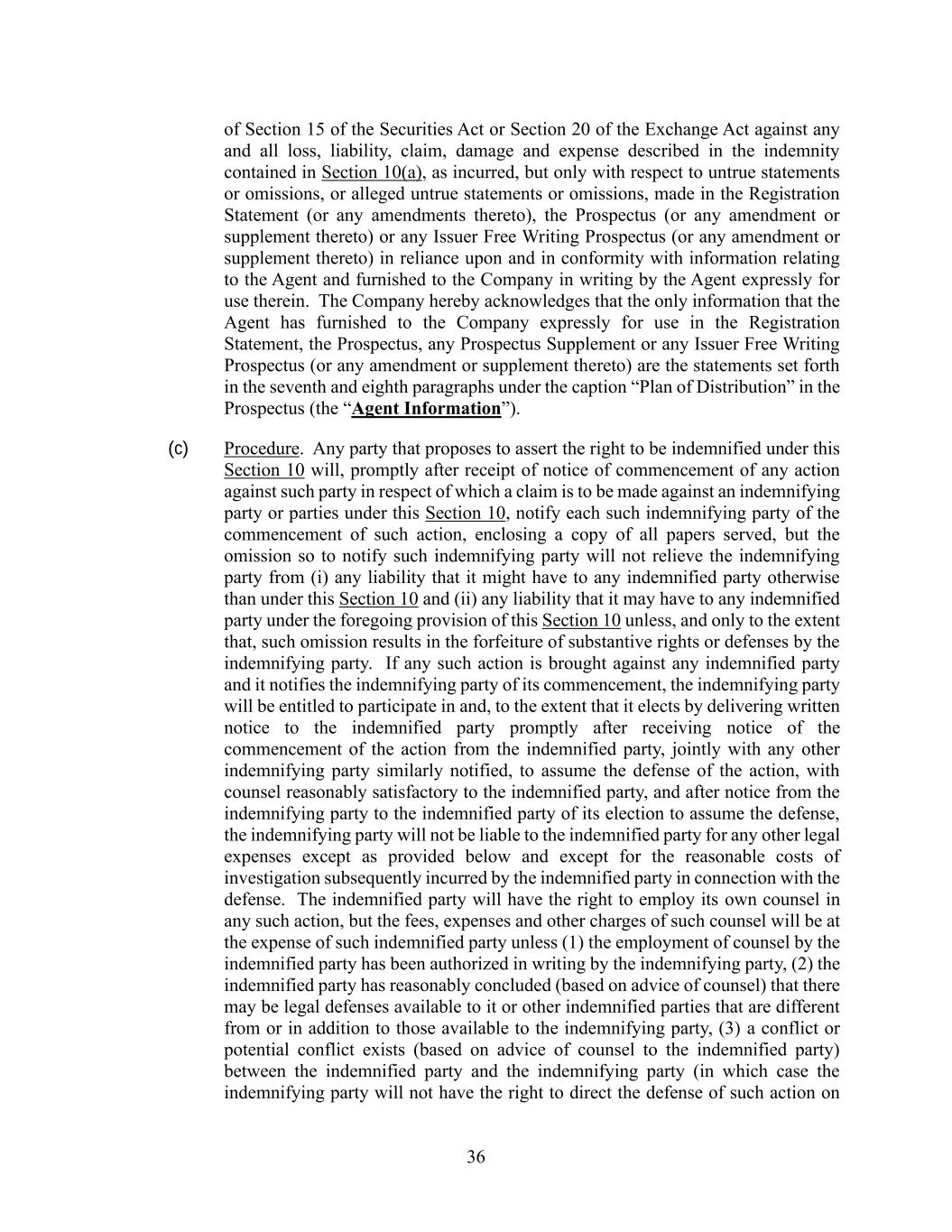 36 of Section 15 of the Securities Act or Section 20 of the Exchange Act against any and all loss, liability, claim, damage and expense described in the indemnity contained in Section 10(a), as incurred, but only with respect to untrue statements or omissions, or alleged untrue statements or omissions, made in the Registration Statement (or any amendments thereto), the Prospectus (or any amendment or supplement thereto) or any Issuer Free Writing Prospectus (or any amendment or supplement thereto) in reliance upon and in conformity with information relating to the Agent and furnished to the Company in writing by the Agent expressly for use therein. The Company hereby acknowledges that the only information that the Agent has furnished to the Company expressly for use in the Registration Statement, the Prospectus, any Prospectus Supplement or any Issuer Free Writing Prospectus (or any amendment or supplement thereto) are the statements set forth in the seventh and eighth paragraphs under the caption “Plan of Distribution” in the Prospectus (the “Agent Information”). (c) Procedure. Any party that proposes to assert the right to be indemnified under this Section 10 will, promptly after receipt of notice of commencement of any action against such party in respect of which a claim is to be made against an indemnifying party or parties under this Section 10, notify each such indemnifying party of the commencement of such action, enclosing a copy of all papers served, but the omission so to notify such indemnifying party will not relieve the indemnifying party from (i) any liability that it might have to any indemnified party otherwise than under this Section 10 and (ii) any liability that it may have to any indemnified party under the foregoing provision of this Section 10 unless, and only to the extent that, such omission results in the forfeiture of substantive rights or defenses by the indemnifying party. If any such action is brought against any indemnified party and it notifies the indemnifying party of its commencement, the indemnifying party will be entitled to participate in and, to the extent that it elects by delivering written notice to the indemnified party promptly after receiving notice of the commencement of the action from the indemnified party, jointly with any other indemnifying party similarly notified, to assume the defense of the action, with counsel reasonably satisfactory to the indemnified party, and after notice from the indemnifying party to the indemnified party of its election to assume the defense, the indemnifying party will not be liable to the indemnified party for any other legal expenses except as provided below and except for the reasonable costs of investigation subsequently incurred by the indemnified party in connection with the defense. The indemnified party will have the right to employ its own counsel in any such action, but the fees, expenses and other charges of such counsel will be at the expense of such indemnified party unless (1) the employment of counsel by the indemnified party has been authorized in writing by the indemnifying party, (2) the indemnified party has reasonably concluded (based on advice of counsel) that there may be legal defenses available to it or other indemnified parties that are different from or in addition to those available to the indemnifying party, (3) a conflict or potential conflict exists (based on advice of counsel to the indemnified party) between the indemnified party and the indemnifying party (in which case the indemnifying party will not have the right to direct the defense of such action on