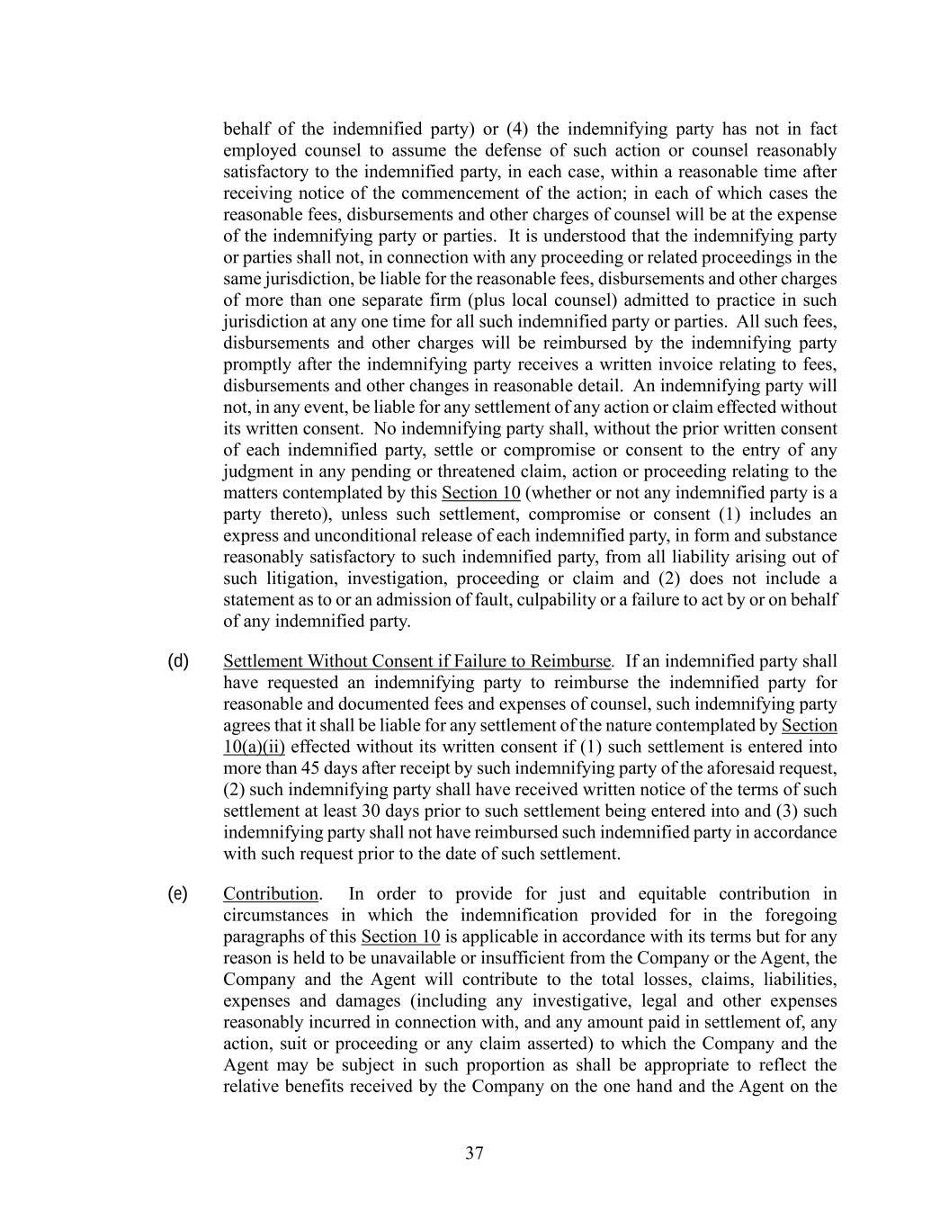 37 behalf of the indemnified party) or (4) the indemnifying party has not in fact employed counsel to assume the defense of such action or counsel reasonably satisfactory to the indemnified party, in each case, within a reasonable time after receiving notice of the commencement of the action; in each of which cases the reasonable fees, disbursements and other charges of counsel will be at the expense of the indemnifying party or parties. It is understood that the indemnifying party or parties shall not, in connection with any proceeding or related proceedings in the same jurisdiction, be liable for the reasonable fees, disbursements and other charges of more than one separate firm (plus local counsel) admitted to practice in such jurisdiction at any one time for all such indemnified party or parties. All such fees, disbursements and other charges will be reimbursed by the indemnifying party promptly after the indemnifying party receives a written invoice relating to fees, disbursements and other changes in reasonable detail. An indemnifying party will not, in any event, be liable for any settlement of any action or claim effected without its written consent. No indemnifying party shall, without the prior written consent of each indemnified party, settle or compromise or consent to the entry of any judgment in any pending or threatened claim, action or proceeding relating to the matters contemplated by this Section 10 (whether or not any indemnified party is a party thereto), unless such settlement, compromise or consent (1) includes an express and unconditional release of each indemnified party, in form and substance reasonably satisfactory to such indemnified party, from all liability arising out of such litigation, investigation, proceeding or claim and (2) does not include a statement as to or an admission of fault, culpability or a failure to act by or on behalf of any indemnified party. (d) Settlement Without Consent if Failure to Reimburse. If an indemnified party shall have requested an indemnifying party to reimburse the indemnified party for reasonable and documented fees and expenses of counsel, such indemnifying party agrees that it shall be liable for any settlement of the nature contemplated by Section 10(a)(ii) effected without its written consent if (1) such settlement is entered into more than 45 days after receipt by such indemnifying party of the aforesaid request, (2) such indemnifying party shall have received written notice of the terms of such settlement at least 30 days prior to such settlement being entered into and (3) such indemnifying party shall not have reimbursed such indemnified party in accordance with such request prior to the date of such settlement. (e) Contribution. In order to provide for just and equitable contribution in circumstances in which the indemnification provided for in the foregoing paragraphs of this Section 10 is applicable in accordance with its terms but for any reason is held to be unavailable or insufficient from the Company or the Agent, the Company and the Agent will contribute to the total losses, claims, liabilities, expenses and damages (including any investigative, legal and other expenses reasonably incurred in connection with, and any amount paid in settlement of, any action, suit or proceeding or any claim asserted) to which the Company and the Agent may be subject in such proportion as shall be appropriate to reflect the relative benefits received by the Company on the one hand and the Agent on the