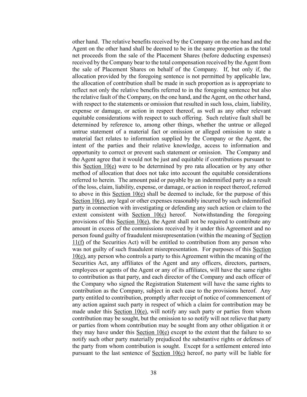 38 other hand. The relative benefits received by the Company on the one hand and the Agent on the other hand shall be deemed to be in the same proportion as the total net proceeds from the sale of the Placement Shares (before deducting expenses) received by the Company bear to the total compensation received by the Agent from the sale of Placement Shares on behalf of the Company. If, but only if, the allocation provided by the foregoing sentence is not permitted by applicable law, the allocation of contribution shall be made in such proportion as is appropriate to reflect not only the relative benefits referred to in the foregoing sentence but also the relative fault of the Company, on the one hand, and the Agent, on the other hand, with respect to the statements or omission that resulted in such loss, claim, liability, expense or damage, or action in respect thereof, as well as any other relevant equitable considerations with respect to such offering. Such relative fault shall be determined by reference to, among other things, whether the untrue or alleged untrue statement of a material fact or omission or alleged omission to state a material fact relates to information supplied by the Company or the Agent, the intent of the parties and their relative knowledge, access to information and opportunity to correct or prevent such statement or omission. The Company and the Agent agree that it would not be just and equitable if contributions pursuant to this Section 10(e) were to be determined by pro rata allocation or by any other method of allocation that does not take into account the equitable considerations referred to herein. The amount paid or payable by an indemnified party as a result of the loss, claim, liability, expense, or damage, or action in respect thereof, referred to above in this Section 10(e) shall be deemed to include, for the purpose of this Section 10(e), any legal or other expenses reasonably incurred by such indemnified party in connection with investigating or defending any such action or claim to the extent consistent with Section 10(c) hereof. Notwithstanding the foregoing provisions of this Section 10(e), the Agent shall not be required to contribute any amount in excess of the commissions received by it under this Agreement and no person found guilty of fraudulent misrepresentation (within the meaning of Section 11(f) of the Securities Act) will be entitled to contribution from any person who was not guilty of such fraudulent misrepresentation. For purposes of this Section 10(e), any person who controls a party to this Agreement within the meaning of the Securities Act, any affiliates of the Agent and any officers, directors, partners, employees or agents of the Agent or any of its affiliates, will have the same rights to contribution as that party, and each director of the Company and each officer of the Company who signed the Registration Statement will have the same rights to contribution as the Company, subject in each case to the provisions hereof. Any party entitled to contribution, promptly after receipt of notice of commencement of any action against such party in respect of which a claim for contribution may be made under this Section 10(e), will notify any such party or parties from whom contribution may be sought, but the omission to so notify will not relieve that party or parties from whom contribution may be sought from any other obligation it or they may have under this Section 10(e) except to the extent that the failure to so notify such other party materially prejudiced the substantive rights or defenses of the party from whom contribution is sought. Except for a settlement entered into pursuant to the last sentence of Section 10(c) hereof, no party will be liable for