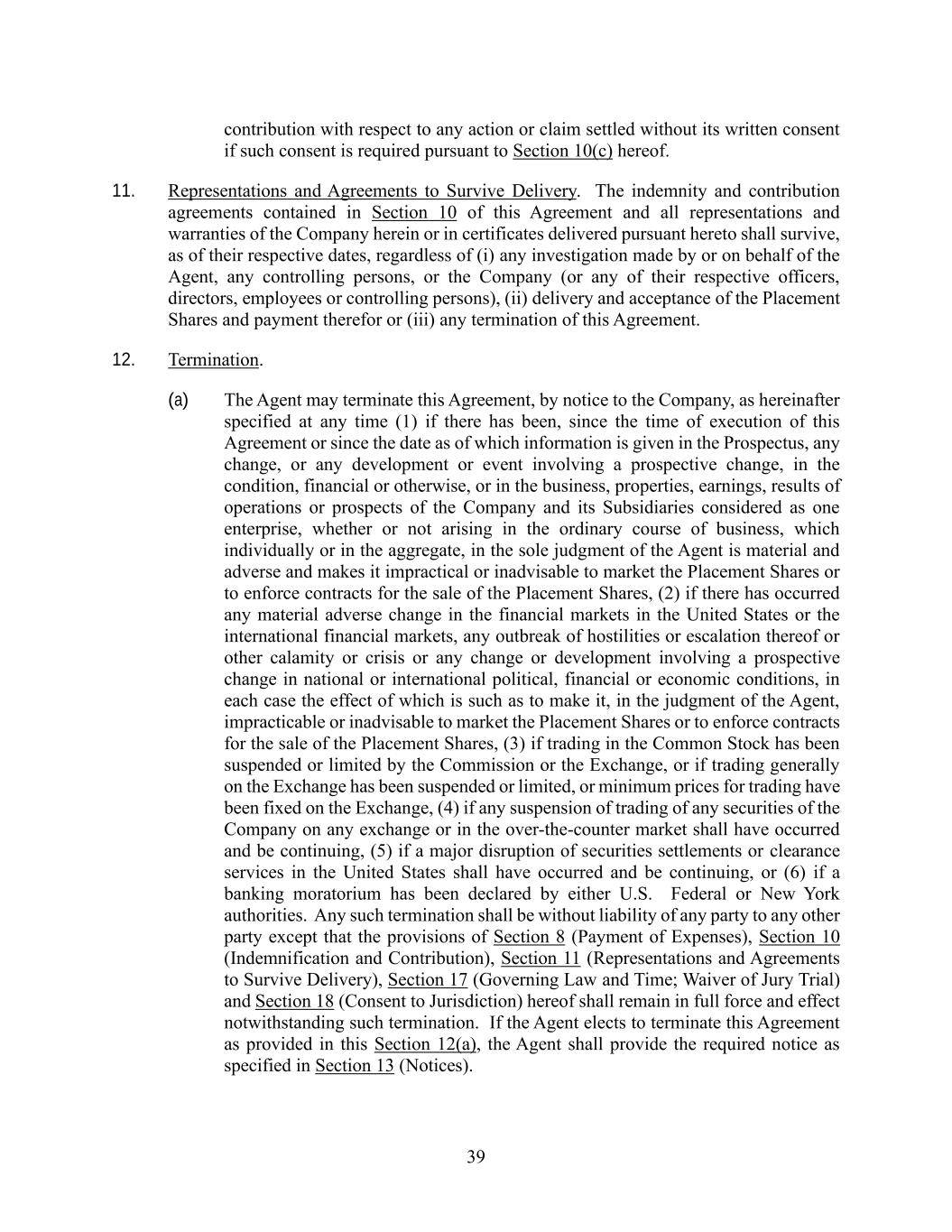39 contribution with respect to any action or claim settled without its written consent if such consent is required pursuant to Section 10(c) hereof. 11. Representations and Agreements to Survive Delivery. The indemnity and contribution agreements contained in Section 10 of this Agreement and all representations and warranties of the Company herein or in certificates delivered pursuant hereto shall survive, as of their respective dates, regardless of (i) any investigation made by or on behalf of the Agent, any controlling persons, or the Company (or any of their respective officers, directors, employees or controlling persons), (ii) delivery and acceptance of the Placement Shares and payment therefor or (iii) any termination of this Agreement. 12. Termination. (a) The Agent may terminate this Agreement, by notice to the Company, as hereinafter specified at any time (1) if there has been, since the time of execution of this Agreement or since the date as of which information is given in the Prospectus, any change, or any development or event involving a prospective change, in the condition, financial or otherwise, or in the business, properties, earnings, results of operations or prospects of the Company and its Subsidiaries considered as one enterprise, whether or not arising in the ordinary course of business, which individually or in the aggregate, in the sole judgment of the Agent is material and adverse and makes it impractical or inadvisable to market the Placement Shares or to enforce contracts for the sale of the Placement Shares, (2) if there has occurred any material adverse change in the financial markets in the United States or the international financial markets, any outbreak of hostilities or escalation thereof or other calamity or crisis or any change or development involving a prospective change in national or international political, financial or economic conditions, in each case the effect of which is such as to make it, in the judgment of the Agent, impracticable or inadvisable to market the Placement Shares or to enforce contracts for the sale of the Placement Shares, (3) if trading in the Common Stock has been suspended or limited by the Commission or the Exchange, or if trading generally on the Exchange has been suspended or limited, or minimum prices for trading have been fixed on the Exchange, (4) if any suspension of trading of any securities of the Company on any exchange or in the over-the-counter market shall have occurred and be continuing, (5) if a major disruption of securities settlements or clearance services in the United States shall have occurred and be continuing, or (6) if a banking moratorium has been declared by either U.S. Federal or New York authorities. Any such termination shall be without liability of any party to any other party except that the provisions of Section 8 (Payment of Expenses), Section 10 (Indemnification and Contribution), Section 11 (Representations and Agreements to Survive Delivery), Section 17 (Governing Law and Time; Waiver of Jury Trial) and Section 18 (Consent to Jurisdiction) hereof shall remain in full force and effect notwithstanding such termination. If the Agent elects to terminate this Agreement as provided in this Section 12(a), the Agent shall provide the required notice as specified in Section 13 (Notices).