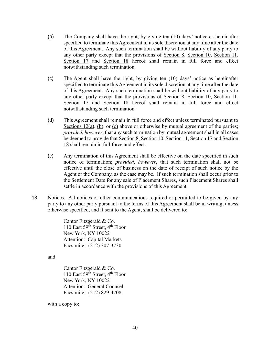 40 (b) The Company shall have the right, by giving ten (10) days’ notice as hereinafter specified to terminate this Agreement in its sole discretion at any time after the date of this Agreement. Any such termination shall be without liability of any party to any other party except that the provisions of Section 8, Section 10, Section 11, Section 17 and Section 18 hereof shall remain in full force and effect notwithstanding such termination. (c) The Agent shall have the right, by giving ten (10) days’ notice as hereinafter specified to terminate this Agreement in its sole discretion at any time after the date of this Agreement. Any such termination shall be without liability of any party to any other party except that the provisions of Section 8, Section 10, Section 11, Section 17 and Section 18 hereof shall remain in full force and effect notwithstanding such termination. (d) This Agreement shall remain in full force and effect unless terminated pursuant to Sections 12(a), (b), or (c) above or otherwise by mutual agreement of the parties; provided, however, that any such termination by mutual agreement shall in all cases be deemed to provide that Section 8, Section 10, Section 11, Section 17 and Section 18 shall remain in full force and effect. (e) Any termination of this Agreement shall be effective on the date specified in such notice of termination; provided, however, that such termination shall not be effective until the close of business on the date of receipt of such notice by the Agent or the Company, as the case may be. If such termination shall occur prior to the Settlement Date for any sale of Placement Shares, such Placement Shares shall settle in accordance with the provisions of this Agreement. 13. Notices. All notices or other communications required or permitted to be given by any party to any other party pursuant to the terms of this Agreement shall be in writing, unless otherwise specified, and if sent to the Agent, shall be delivered to: Cantor Fitzgerald & Co. 110 East 59th Street, 4th Floor New York, NY 10022 Attention: Capital Markets Facsimile: (212) 307-3730 and: Cantor Fitzgerald & Co. 110 East 59th Street, 4th Floor New York, NY 10022 Attention: General Counsel Facsimile: (212) 829-4708 with a copy to: