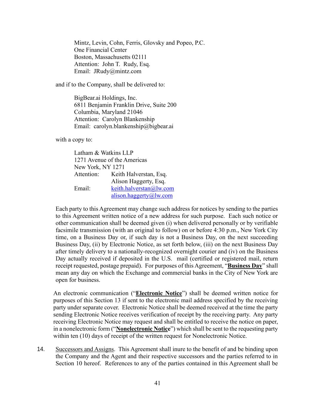 41 Mintz, Levin, Cohn, Ferris, Glovsky and Popeo, P.C. One Financial Center Boston, Massachusetts 02111 Attention: John T. Rudy, Esq. Email: JRudy@mintz.com and if to the Company, shall be delivered to: BigBear.ai Holdings, Inc. 6811 Benjamin Franklin Drive, Suite 200 Columbia, Maryland 21046 Attention: Carolyn Blankenship Email: carolyn.blankenship@bigbear.ai with a copy to: Latham & Watkins LLP 1271 Avenue of the Americas New York, NY 1271 Attention: Keith Halverstan, Esq. Alison Haggerty, Esq. Email: keith.halverstan@lw.com alison.haggerty@lw.com Each party to this Agreement may change such address for notices by sending to the parties to this Agreement written notice of a new address for such purpose. Each such notice or other communication shall be deemed given (i) when delivered personally or by verifiable facsimile transmission (with an original to follow) on or before 4:30 p.m., New York City time, on a Business Day or, if such day is not a Business Day, on the next succeeding Business Day, (ii) by Electronic Notice, as set forth below, (iii) on the next Business Day after timely delivery to a nationally-recognized overnight courier and (iv) on the Business Day actually received if deposited in the U.S. mail (certified or registered mail, return receipt requested, postage prepaid). For purposes of this Agreement, “Business Day” shall mean any day on which the Exchange and commercial banks in the City of New York are open for business. An electronic communication (“Electronic Notice”) shall be deemed written notice for purposes of this Section 13 if sent to the electronic mail address specified by the receiving party under separate cover. Electronic Notice shall be deemed received at the time the party sending Electronic Notice receives verification of receipt by the receiving party. Any party receiving Electronic Notice may request and shall be entitled to receive the notice on paper, in a nonelectronic form (“Nonelectronic Notice”) which shall be sent to the requesting party within ten (10) days of receipt of the written request for Nonelectronic Notice. 14. Successors and Assigns. This Agreement shall inure to the benefit of and be binding upon the Company and the Agent and their respective successors and the parties referred to in Section 10 hereof. References to any of the parties contained in this Agreement shall be
