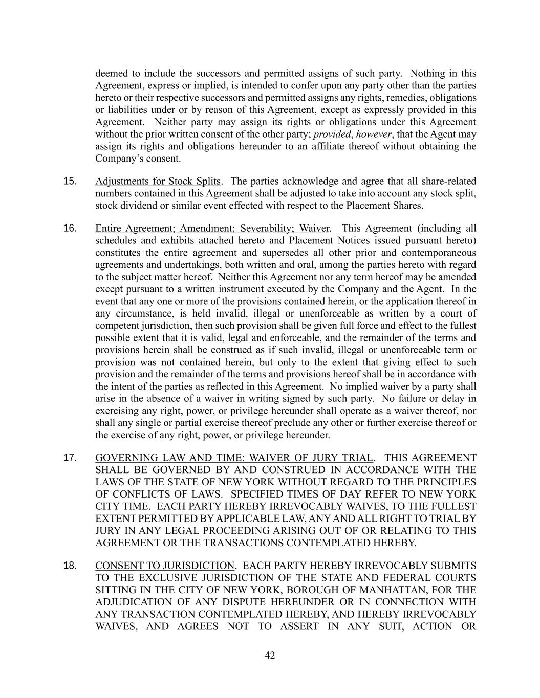 42 deemed to include the successors and permitted assigns of such party. Nothing in this Agreement, express or implied, is intended to confer upon any party other than the parties hereto or their respective successors and permitted assigns any rights, remedies, obligations or liabilities under or by reason of this Agreement, except as expressly provided in this Agreement. Neither party may assign its rights or obligations under this Agreement without the prior written consent of the other party; provided, however, that the Agent may assign its rights and obligations hereunder to an affiliate thereof without obtaining the Company’s consent. 15. Adjustments for Stock Splits. The parties acknowledge and agree that all share-related numbers contained in this Agreement shall be adjusted to take into account any stock split, stock dividend or similar event effected with respect to the Placement Shares. 16. Entire Agreement; Amendment; Severability; Waiver. This Agreement (including all schedules and exhibits attached hereto and Placement Notices issued pursuant hereto) constitutes the entire agreement and supersedes all other prior and contemporaneous agreements and undertakings, both written and oral, among the parties hereto with regard to the subject matter hereof. Neither this Agreement nor any term hereof may be amended except pursuant to a written instrument executed by the Company and the Agent. In the event that any one or more of the provisions contained herein, or the application thereof in any circumstance, is held invalid, illegal or unenforceable as written by a court of competent jurisdiction, then such provision shall be given full force and effect to the fullest possible extent that it is valid, legal and enforceable, and the remainder of the terms and provisions herein shall be construed as if such invalid, illegal or unenforceable term or provision was not contained herein, but only to the extent that giving effect to such provision and the remainder of the terms and provisions hereof shall be in accordance with the intent of the parties as reflected in this Agreement. No implied waiver by a party shall arise in the absence of a waiver in writing signed by such party. No failure or delay in exercising any right, power, or privilege hereunder shall operate as a waiver thereof, nor shall any single or partial exercise thereof preclude any other or further exercise thereof or the exercise of any right, power, or privilege hereunder. 17. GOVERNING LAW AND TIME; WAIVER OF JURY TRIAL. THIS AGREEMENT SHALL BE GOVERNED BY AND CONSTRUED IN ACCORDANCE WITH THE LAWS OF THE STATE OF NEW YORK WITHOUT REGARD TO THE PRINCIPLES OF CONFLICTS OF LAWS. SPECIFIED TIMES OF DAY REFER TO NEW YORK CITY TIME. EACH PARTY HEREBY IRREVOCABLY WAIVES, TO THE FULLEST EXTENT PERMITTED BY APPLICABLE LAW, ANY AND ALL RIGHT TO TRIAL BY JURY IN ANY LEGAL PROCEEDING ARISING OUT OF OR RELATING TO THIS AGREEMENT OR THE TRANSACTIONS CONTEMPLATED HEREBY. 18. CONSENT TO JURISDICTION. EACH PARTY HEREBY IRREVOCABLY SUBMITS TO THE EXCLUSIVE JURISDICTION OF THE STATE AND FEDERAL COURTS SITTING IN THE CITY OF NEW YORK, BOROUGH OF MANHATTAN, FOR THE ADJUDICATION OF ANY DISPUTE HEREUNDER OR IN CONNECTION WITH ANY TRANSACTION CONTEMPLATED HEREBY, AND HEREBY IRREVOCABLY WAIVES, AND AGREES NOT TO ASSERT IN ANY SUIT, ACTION OR