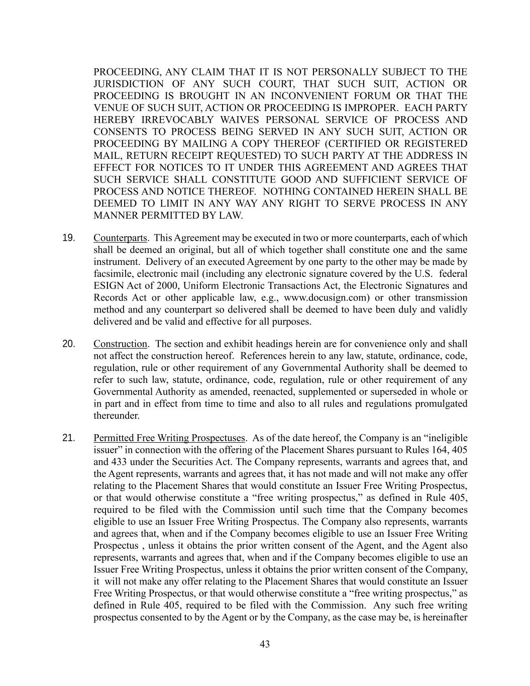 43 PROCEEDING, ANY CLAIM THAT IT IS NOT PERSONALLY SUBJECT TO THE JURISDICTION OF ANY SUCH COURT, THAT SUCH SUIT, ACTION OR PROCEEDING IS BROUGHT IN AN INCONVENIENT FORUM OR THAT THE VENUE OF SUCH SUIT, ACTION OR PROCEEDING IS IMPROPER. EACH PARTY HEREBY IRREVOCABLY WAIVES PERSONAL SERVICE OF PROCESS AND CONSENTS TO PROCESS BEING SERVED IN ANY SUCH SUIT, ACTION OR PROCEEDING BY MAILING A COPY THEREOF (CERTIFIED OR REGISTERED MAIL, RETURN RECEIPT REQUESTED) TO SUCH PARTY AT THE ADDRESS IN EFFECT FOR NOTICES TO IT UNDER THIS AGREEMENT AND AGREES THAT SUCH SERVICE SHALL CONSTITUTE GOOD AND SUFFICIENT SERVICE OF PROCESS AND NOTICE THEREOF. NOTHING CONTAINED HEREIN SHALL BE DEEMED TO LIMIT IN ANY WAY ANY RIGHT TO SERVE PROCESS IN ANY MANNER PERMITTED BY LAW. 19. Counterparts. This Agreement may be executed in two or more counterparts, each of which shall be deemed an original, but all of which together shall constitute one and the same instrument. Delivery of an executed Agreement by one party to the other may be made by facsimile, electronic mail (including any electronic signature covered by the U.S. federal ESIGN Act of 2000, Uniform Electronic Transactions Act, the Electronic Signatures and Records Act or other applicable law, e.g., www.docusign.com) or other transmission method and any counterpart so delivered shall be deemed to have been duly and validly delivered and be valid and effective for all purposes. 20. Construction. The section and exhibit headings herein are for convenience only and shall not affect the construction hereof. References herein to any law, statute, ordinance, code, regulation, rule or other requirement of any Governmental Authority shall be deemed to refer to such law, statute, ordinance, code, regulation, rule or other requirement of any Governmental Authority as amended, reenacted, supplemented or superseded in whole or in part and in effect from time to time and also to all rules and regulations promulgated thereunder. 21. Permitted Free Writing Prospectuses. As of the date hereof, the Company is an “ineligible issuer” in connection with the offering of the Placement Shares pursuant to Rules 164, 405 and 433 under the Securities Act. The Company represents, warrants and agrees that, and the Agent represents, warrants and agrees that, it has not made and will not make any offer relating to the Placement Shares that would constitute an Issuer Free Writing Prospectus, or that would otherwise constitute a “free writing prospectus,” as defined in Rule 405, required to be filed with the Commission until such time that the Company becomes eligible to use an Issuer Free Writing Prospectus. The Company also represents, warrants and agrees that, when and if the Company becomes eligible to use an Issuer Free Writing Prospectus , unless it obtains the prior written consent of the Agent, and the Agent also represents, warrants and agrees that, when and if the Company becomes eligible to use an Issuer Free Writing Prospectus, unless it obtains the prior written consent of the Company, it will not make any offer relating to the Placement Shares that would constitute an Issuer Free Writing Prospectus, or that would otherwise constitute a “free writing prospectus,” as defined in Rule 405, required to be filed with the Commission. Any such free writing prospectus consented to by the Agent or by the Company, as the case may be, is hereinafter