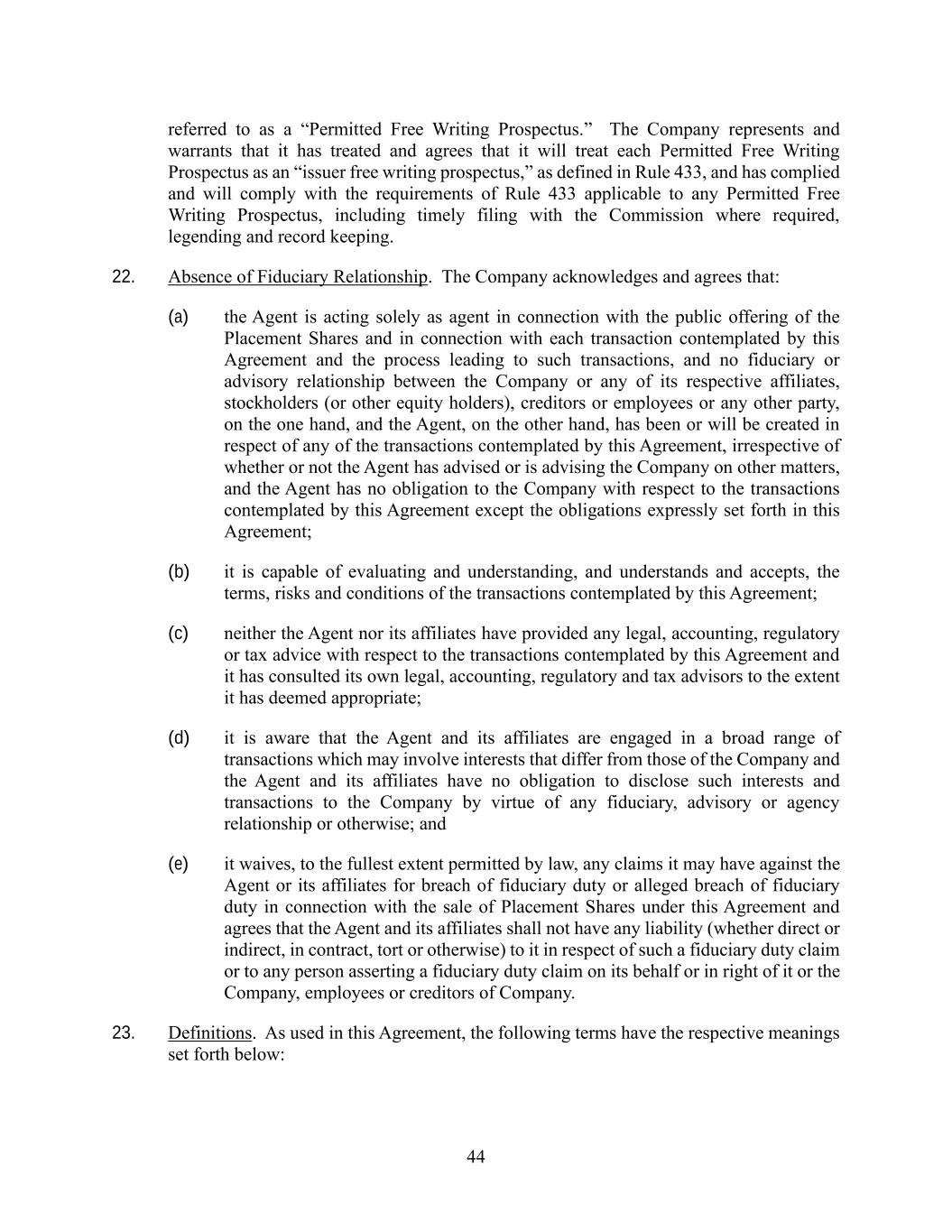44 referred to as a “Permitted Free Writing Prospectus.” The Company represents and warrants that it has treated and agrees that it will treat each Permitted Free Writing Prospectus as an “issuer free writing prospectus,” as defined in Rule 433, and has complied and will comply with the requirements of Rule 433 applicable to any Permitted Free Writing Prospectus, including timely filing with the Commission where required, legending and record keeping. 22. Absence of Fiduciary Relationship. The Company acknowledges and agrees that: (a) the Agent is acting solely as agent in connection with the public offering of the Placement Shares and in connection with each transaction contemplated by this Agreement and the process leading to such transactions, and no fiduciary or advisory relationship between the Company or any of its respective affiliates, stockholders (or other equity holders), creditors or employees or any other party, on the one hand, and the Agent, on the other hand, has been or will be created in respect of any of the transactions contemplated by this Agreement, irrespective of whether or not the Agent has advised or is advising the Company on other matters, and the Agent has no obligation to the Company with respect to the transactions contemplated by this Agreement except the obligations expressly set forth in this Agreement; (b) it is capable of evaluating and understanding, and understands and accepts, the terms, risks and conditions of the transactions contemplated by this Agreement; (c) neither the Agent nor its affiliates have provided any legal, accounting, regulatory or tax advice with respect to the transactions contemplated by this Agreement and it has consulted its own legal, accounting, regulatory and tax advisors to the extent it has deemed appropriate; (d) it is aware that the Agent and its affiliates are engaged in a broad range of transactions which may involve interests that differ from those of the Company and the Agent and its affiliates have no obligation to disclose such interests and transactions to the Company by virtue of any fiduciary, advisory or agency relationship or otherwise; and (e) it waives, to the fullest extent permitted by law, any claims it may have against the Agent or its affiliates for breach of fiduciary duty or alleged breach of fiduciary duty in connection with the sale of Placement Shares under this Agreement and agrees that the Agent and its affiliates shall not have any liability (whether direct or indirect, in contract, tort or otherwise) to it in respect of such a fiduciary duty claim or to any person asserting a fiduciary duty claim on its behalf or in right of it or the Company, employees or creditors of Company. 23. Definitions. As used in this Agreement, the following terms have the respective meanings set forth below:
