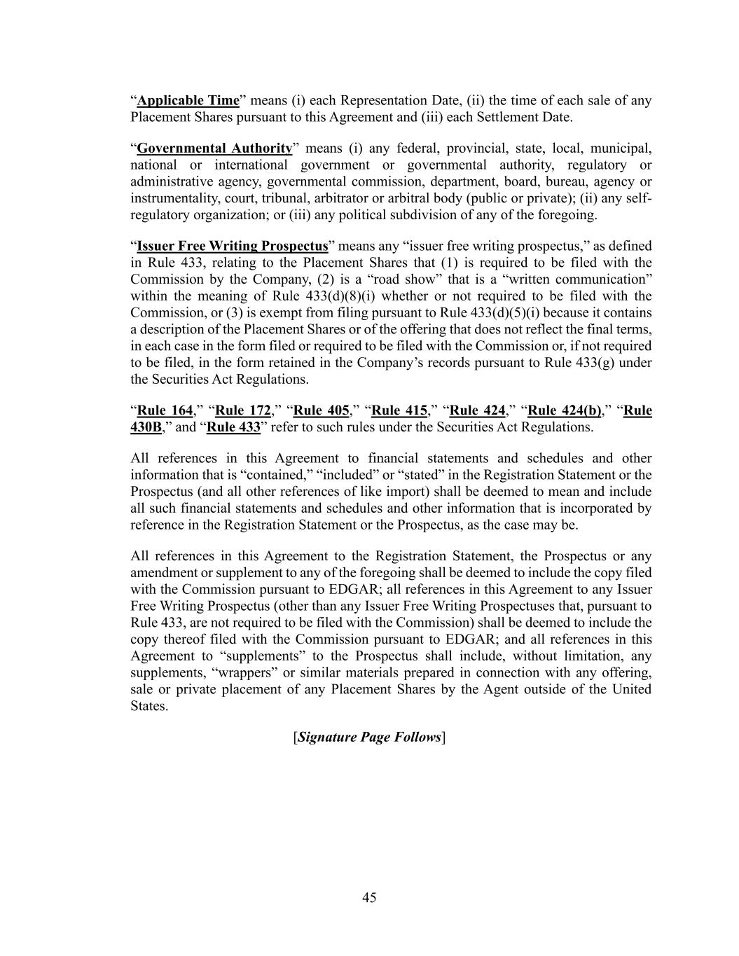 45 “Applicable Time” means (i) each Representation Date, (ii) the time of each sale of any Placement Shares pursuant to this Agreement and (iii) each Settlement Date. “Governmental Authority” means (i) any federal, provincial, state, local, municipal, national or international government or governmental authority, regulatory or administrative agency, governmental commission, department, board, bureau, agency or instrumentality, court, tribunal, arbitrator or arbitral body (public or private); (ii) any self- regulatory organization; or (iii) any political subdivision of any of the foregoing. “Issuer Free Writing Prospectus” means any “issuer free writing prospectus,” as defined in Rule 433, relating to the Placement Shares that (1) is required to be filed with the Commission by the Company, (2) is a “road show” that is a “written communication” within the meaning of Rule 433(d)(8)(i) whether or not required to be filed with the Commission, or (3) is exempt from filing pursuant to Rule 433(d)(5)(i) because it contains a description of the Placement Shares or of the offering that does not reflect the final terms, in each case in the form filed or required to be filed with the Commission or, if not required to be filed, in the form retained in the Company’s records pursuant to Rule 433(g) under the Securities Act Regulations. “Rule 164,” “Rule 172,” “Rule 405,” “Rule 415,” “Rule 424,” “Rule 424(b),” “Rule 430B,” and “Rule 433” refer to such rules under the Securities Act Regulations. All references in this Agreement to financial statements and schedules and other information that is “contained,” “included” or “stated” in the Registration Statement or the Prospectus (and all other references of like import) shall be deemed to mean and include all such financial statements and schedules and other information that is incorporated by reference in the Registration Statement or the Prospectus, as the case may be. All references in this Agreement to the Registration Statement, the Prospectus or any amendment or supplement to any of the foregoing shall be deemed to include the copy filed with the Commission pursuant to EDGAR; all references in this Agreement to any Issuer Free Writing Prospectus (other than any Issuer Free Writing Prospectuses that, pursuant to Rule 433, are not required to be filed with the Commission) shall be deemed to include the copy thereof filed with the Commission pursuant to EDGAR; and all references in this Agreement to “supplements” to the Prospectus shall include, without limitation, any supplements, “wrappers” or similar materials prepared in connection with any offering, sale or private placement of any Placement Shares by the Agent outside of the United States. [Signature Page Follows]