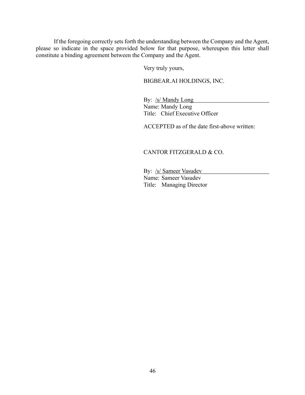46 If the foregoing correctly sets forth the understanding between the Company and the Agent, please so indicate in the space provided below for that purpose, whereupon this letter shall constitute a binding agreement between the Company and the Agent. Very truly yours, BIGBEAR.AI HOLDINGS, INC. By: /s/ Mandy Long Name: Mandy Long Title: Chief Executive Officer ACCEPTED as of the date first-above written: CANTOR FITZGERALD & CO. By: /s/ Sameer Vasudev Name: Sameer Vasudev Title: Managing Director